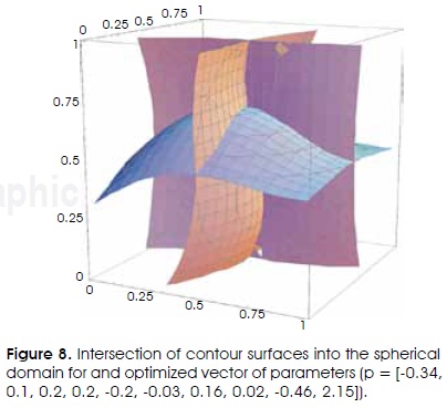 In figures 2, 3 and 4 are shown violations to the one-toone correspondence described by the vector of parameters p. It can be observed in these figures how the contour surfaces intersect each other more than once or an intersection is absent. For example, in figures 2 and 4 the position in the source volume Xs = (0.95, 0.5, 0.8), is transformed to several new positions. This is due to the surface contour curvature always defined by the vector of parameters. In figure 4 is shown an example of a lack of a junction point among the three contour surfaces in the spherical domain.