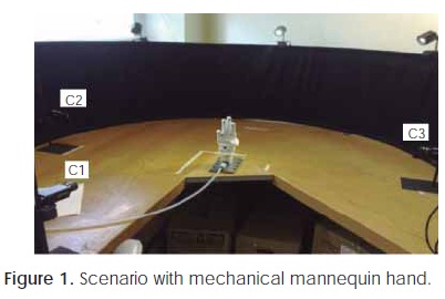 c) Design of the scenario with controlled light. A reference XYZ frame located on dark room to control light, is designed to guarantee the trustworthiness of the measurements. Scenario is a quasi-circumference structure of 2 m in diameter and 60 cm in height, wrapped with black textile and has six light bulbs (daylight led lights) in six equidistant points (60°) on the top to produce a uniform light to center of the scenario, where the hand is positioned over an ergonomic support. At the same time, three cameras (C1, C2 and C3) are installed with separations of 90°, 80 cmfromthecenterand the height is adjusted according to the long arm of the subject (Figure 1).