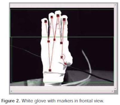 Chiu et cols have used video-based motion analysis systems to evaluate fingertip motions in hand injury patients10. However, when they want to measure three or more fingers it presents some problems of visibility and repeatability11. Other researches are directed towards demonstrating the validity of video motion analysis for measuring finger flexion and extension12 with multiple cameras13 and in real time14.
