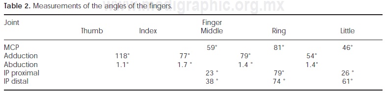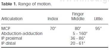 Table 1 shows some standard arc of mobility of the fingers for metacarpophalangeal (or MCP), proximal and distal interphalangeal (or IP) articulations as well as abduction and adduction amplitudes to achieve daily life activities described by Hume4 and Velázquez5.