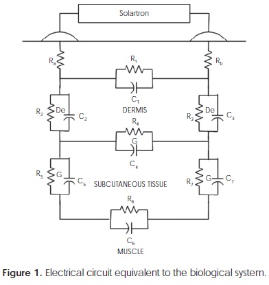 According to Rigaud1 who at the beginning of the 20th century began to study the structure of biological tissues based on their electrical properties, biological tissues are conductors and their resistancevarieswith frequency. The electrical property of any biological tissue depends on its intrinsic structure. In the case of human skin, the impedance can vary with the thickness and moisture content of the organ, the concentration and activity of sweat glands, injuries, age of subject and environmental factors such as temperature and humidity. Electrical impedance studies in biological systems, including human skin, generally, relate to direct measurements of impedance and phase angle as functions of frequency, voltage or current applied2-6. In 1974, Burton7 applied the Bode analysis to measurements of impedance and phase angle of the skin. Through this method, a passive equivalent circuit can be using and considered as a «black box» to plot its impedance andphaseangle versus frequency. The only necessary assumption is that the system consists only of linear passive elements7-8. Although the resulting model is not necessarily unique7, it describes the system with great precision in the range of frequencies studied. The electrical impedance spectroscopy (EIA) has proven useful in the characterization of biomaterials, recording the behavior of their intrinsic properties by applying a sinusoidal excitation signal. The application of this technique evaluates the bio-electrical response of the system taking into account the frequency and the output stage9. It has also been used to measure biological tissues in which the electrical impedance depends on water content and ionic conduction in the body. It should be noted that the electrical impedance and resistance terms are used without distinction in literature, since the value of the capacitive reactance is very low in humans for the frequencies under study10. In terms of frequency, some researches have reported that when the frequency is less than or equal to 10 kHz, the current does not cross the cell membrane, and thus the resistance obtained is relative only to the extracellular mass11. This electrical conductivity is greater in adipose tissue compared to fat-free tissue. The resistivity of components such as blood (1.42 Ω/cm) or urine (2 Ω/cm) is low, muscle (20 Ω/cm) and bone (100 Ω/cm) are intermediate, and fat (50 Ω/cm) is high. In the measurement of bioimpedance an electrical stimulus is applied and then the response it produces on a specific region of the body is analyzed. Usually, the stimulus is an alternating current signal of low amplitude intended to measure the electric field or potential difference generated between different parts of the tissue. The relationship between the data of the stimulus applied and the response obtained as a function of frequency provides the impedance spectrum of tissues studied. To extract useful information from the EIA it is necessary to correlate the experimental data with a physiological mechanism, directly, or fit a model with the parameters to establish this relationship with the physiology12.