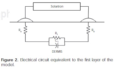 It is known that in biological systems, the module of the impedance is inversely proportional to frequency and does not show phenomena of conversion of electrical energy to magnetic energy14. Therefore, it is considered appropriate to model a biological system considering only the capacitive and resistive behavior. Figure 2, shows the circuit equivalent to the first layer of the system; then, applying Kirchhoff's Laws the following representation of state equations is obtained: