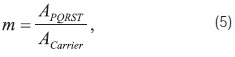 where APQRST and ACarrier are the amplitude of the PQRST complex and the signal carrier respectively. In general m depends inversely on the source-receiver separation, so that a coherent demodulation of the signals is required.