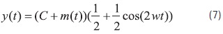 where C is a constant that depends on the carrier signal amplitude. Multiplying Eq. (6) by cos(wt) and using the trigonometric identity cos2(θ) = V + cos(2θ)/2 we obtain Eq. (7)