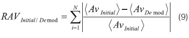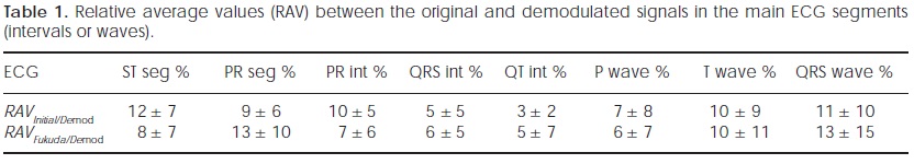 In order to compare the PQRST traces with our device initially and after demodulation, the differences of the mean values of: PR segment, ST segment, PR interval, QRS interval, QT interval, P wave amplitude, QRS wave amplitude and T wave amplitude were calculated in each case. Moreover the mean of the absolute values of the Relative Average Values (RAV) were obtained from Eq. (9). In Table 1 displays the values of RAV with its respective standard deviation. It is mainly observed differences of 12 ± 7% in the ST segment and of 11 ± 10% in the QRS wave, the minimum differences are observed in the QT interval of 3 ± 2%.