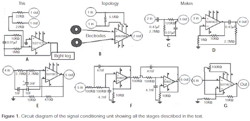 1) Isolation and patient protection (Figure 1(A)) against electrical shock using a multiple propose operational amplifier TL071. The task of isolation is mainly performed by the capacitor of 0.01 µf; it decouples the grounded right leg from the power supply.