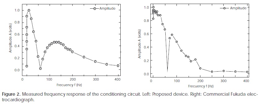 This topology makes possible to obtain a common rejection mode around 110 dB, input impedance bigger than 1 GΩ, base line restoration less than 1 second and offset control. All the values of gains and band-pass filtering are in accordance to the literature reports 13-15, 17-20. The measured frequency response for both, the proposed device and the commercial Fukuda electrocardiograph, are displayed in Figure 2.