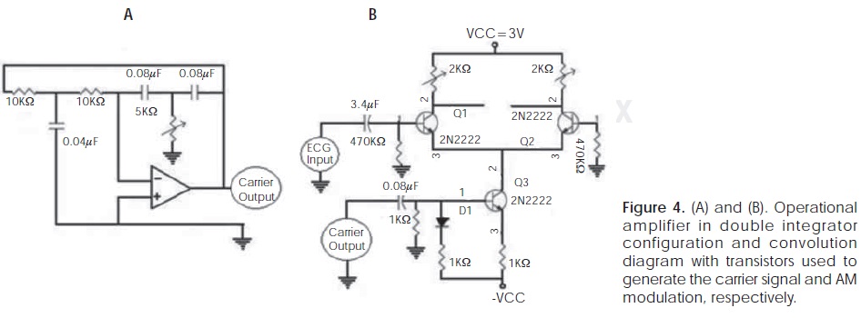 Moreover PC audio inputs are usually an analogical interface with a threshold voltage range ± 1V, and have an ADC with an 8 or 16 bits resolution and a maximum acquisition rate of 192 kS/s. In order to pass segments of cardiac records through sound input channels it is necessary to modulate the obtained signal in amplitude (AM), the carrier signal selected to perform the modulation is in the human audible range (1.91 kHz). An operational amplifier in double integrator configuration (Figure 4A) and an arrangement of transistors are used to perform the convolution of both signals (Figure 4B).