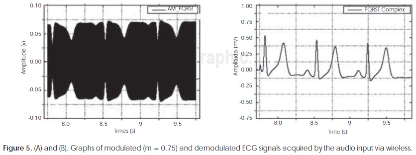Due to the fact that signal is modulated in AM and its carrier is in the audible range it can be transmitted using a transceiver for wireless audio, preferably in a FM band to avoid amplitude degradation in the reception stage16,19. For this purpose we use a commercial low price (around US$ 14) Transmitter-Receiver (STEREN MIC-219). This model possesses a frequency response range of 80 Hz to 12.5 kHz, sensibility -42dB, input impedance 2.1 kΩ and a maximum distance range of 30 m (90.9 ft). It is important to emphasize that the signal introduced into the FM transmitter is the AM modulation of the ECG signal and the central frequency of its spectrum is in 1.91 kHz, a safe value within the frequency response. The output signal of the Transmitter-Receiver device has the AM modulated cardiac signal which is introduced into the audio input of the PC. In Figure 5A, is shown the cardiac modulated signal with a modulation factor m given in the Eq. (5).