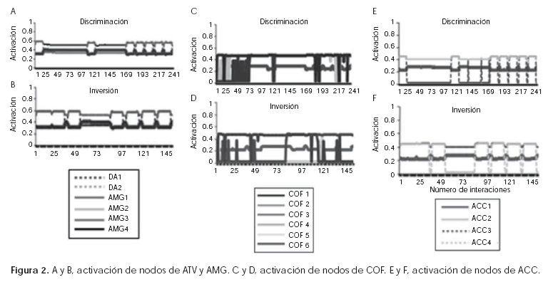 En la Figura 2 se presentan los valores de activación de los diversos nodos de una de las redes intactas evaluadas. En las gráficas A y B se muestra la actividad de los nodos de AMG y ATV durante la discriminación y la inversión.