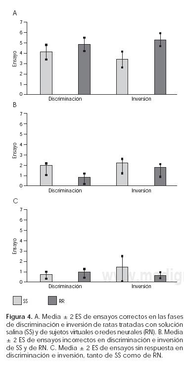 Finalmente, el modelo buscó la emulación de las respuestas de discriminación e inversión de ratas tratadas con solución salina (grupo SS, n = 12) de un estudio experimental realizado con anterioridad20. Se encontró que los sujetos virtuales obtuvieron un número de respuestas correctas (discriminación,