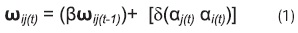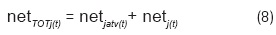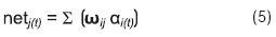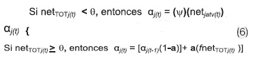 donde: αiatv(t) = estado de activación del i -ésimo elemento de ATV; ωijatv= peso de la conexión entre las unidades i y j, siendo i un elemento de ATV; ƒnetTOTj(t) se define igual que en (4), utilizando netTOTj en lugar de netj.
