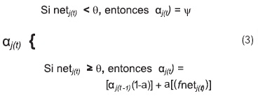 donde: θ= umbral del nodo neural asignado aleatoriamente a través de una curva Gaussiana con parámetros μ= 0.05 y σ=0.025 (parámetro semejante a Donahoe, Burgos y Palmer10); ψ= estado de activación basal de los nodos asignado aleatoriamente a través de una curva de probabilidad gaussiana con parámetros iguales a los de θ; a = tasa de decremento de 0.75 (parámetro similar al utilizado en Donahoe, Burgos y Palmer10);ωij= peso de la conexión entre las unidades i y j.