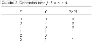 Las memorias asociativas alfa-beta27 utilizan el operador α en la fase de aprendizaje, y el operador β es usado en la fase de recuperación de patrones. Los conjuntos A y B, los cuales son: A = {0, 1} y B = {0, 1, 2} definen las operaciones binarias α y β mostradas en los cuadros 1 y 2, respectivamente.