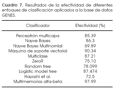 El cuadro 7 muestra los resultados obtenidos por algunos algoritmos de clasificación que se aplicaron a la base de datos GENES mediante la herramienta llamada WEKA30 versión 3.7.5. Este sistema contiene la implementación de varios clasificadores con distintos enfoques, por ejemplo: Bayes, regresión lineal, redes neuronales, basados en reglas, machine learning, entre otros. El formato original de la base de datos tuvo que ser modificado y convertido a mano al formato ARFF que maneja el software WEKA.