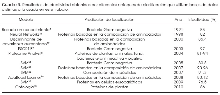 En el cuadro 8 se pueden observar otros algoritmos de clasificación utilizados en la predicción de la localización de proteínas utilizando diferentes bases de datos.