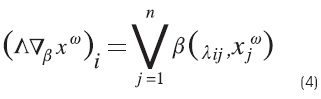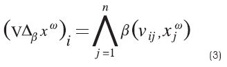 Paso 2. Se aplica el operador binario máximo v a las matrices obtenidas en el paso 1, si la memoria es de tipo máx, y si es de tipo mín entonces se aplica el operador binario mínimo A , como se muestra en las ecuaciones (1) y (2):