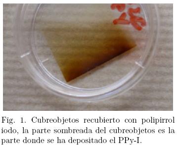 La superficie de los cubreobjetos con PPy-I se prepararon por polimerización por plasma con el siguiente protocolo: dentro del reactor de vacio se empleó una presión de (9 × 10−2 Torr) medida con un sensor de vacio (Edwards Active Gauge Control). Se utilizó una potencia de 50 watts reales, obtenidos de una fuente de Radio frecuencia a 13.5 MHz (Dressler Cesar RF). Como monómeros empleamos Pirrol (98% Sigma-Aldrich) y Iodo (98% Sigma-Aldrich). Se polimerizó durante 20 minutos alternando 4 minutos con pirrol y Iodo, 6 minutos con pirrol, 4 minutos con pirrol y iodo y finalmente 6 minutos con pirrol. La superficie del material modificado con PPy-I se muestra en la Fig. 1.