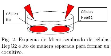 Para los cocultivos se utilizó una densidad de sembrado de 2.25 × 105 de células Ito (paso 6) y 5 × 105 de células HepG2 (paso 85), las células fueron contadas con una cámara de Neubauer. Esta selección se decidió con base en la estructura no parenquimal de las células Ito dentro de un hígado in vivo estando en mayor proporción la cantidad de hepatocitos.