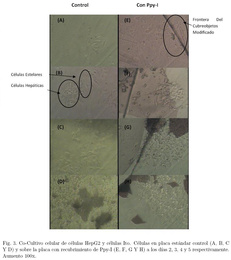 Aunque se tienen antecedentes del cultivo de células HEPG2 sobre superficies tratadas con polipirrol [11], no así para el caso de las células Ito. En este trabajo se muestra que la proliferación celular en el cocultivo no se ve afectado por la presencia del PPy-I en la superficie donde fueron sembradas.