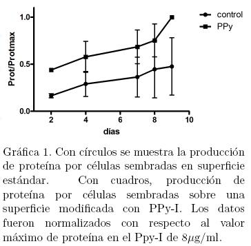 Por último se midió la cantidad de proteínas totales secretadas al medio de cultivo a diferentes días del cocultivo celular. En el cocultivo sobre el cubreobjetos con superficie modificada con PPy-I, se obtuvo una mayor producción de proteínas totales en comparación a los cultivos realizados sobre la caja estándar, tal como se muestra en la Gráfica 1. Las mediciones se realizaron por duplicado (n = 2). Las líneas verticales indican la desviación estándar. Las diferencias entre el control y el experimental fueron significativas (p < .05).