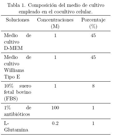 Se utilizó una mezcla de medios de cultivo Williams tipo E suplementado y D-MEM suplementado en una proporción 1:1 como se muestra en la Tabla 1, Los medios Williams y D-MEM son los empleados para hepatocitos y células Ito respectivamente. Se sembraron los cocultivos en dos tipos de superficies por duplicado: en el primer caso se empleó un plato de cultivo estándar de 35 mm de diámetro por 10 mm de altura, con un área de crecimiento de 8cm2 con recubrimiento de lisina (Corning #430165); en el otro, se empleó un cubreobjetos que fue polimerizado con polipirrol dopado con iodo (PPy-I), que se encontraba estéril debido a que al ser polimerizado por plasma, el gas ionizado funciona como esterilizador; y antes de sembrar el cocultivo, el cubreobjetos fue puesto durante 2 días debajo de luz ultravioleta, para tener una superficie óptima.