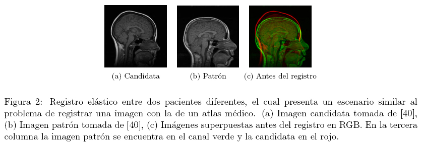 El registro de imágenes se ha convertido en una tarea muy importante en el área de procesamiento digital de imágenes médicas, ya que puede ser empleado en varios procesos como: caracterización de los cambios anatómicos del corazón en un ciclo cardíaco o la atrofia gradual del cerebro en el envejecimiento; comparación o modelado de estructuras anatómicas (morfometría); segmentación de estructuras o tejidos por medio de átlases médicos; corrección de los artefactos causados por el movimiento en imágenes fetales; detección de las discrepancias entre imágenes de un mismo paciente que fueron adquiridas durante distintas etapas de algún tratamiento; entre muchas otras [1, 2, 3, 4]. De acuerdo a los tipos de deformaciones que se deseen aproximar con el registro, éste puede dividirse en dos: en el registro paramétrico y en el elástico o no paramétrico [5]. En la literatura, las técnicas basadas en el descenso (o ascenso) de gradiente [6], [7] son las más comúnmente utilizadas para optimizar una medida de similitud (ej. Información Mutua [8, 9, 10]) y obtener la transformación espacial (ej. afín o perspectiva [11]) que alinee las imágenes candidata y patrón [5]. Otras opciones basadas en metodos de optimización global como los algoritmos genéticos [12] y filtrado de partículas [13], han comenzado a ganar terreno dentro de este campo [14, 15, 16]. Por otro lado, el registro elástico es un problema más complejo que el registro paramétrico [3], especialmente cuando se intentan registrar imágenes provenientes de distintas fuentes (registro multimodal). El registro elástico es un área de investigación relativamente reciente donde la mayoría de los algoritmos desarrollados se encuentran en sus primeras etapas de evaluación y validación [17], y pocas veces buscan resolver el problema para imágenes multimodales, y de hacerlo, generalmente se centran en parametrizar el espacio de deformaciones para optimizar una medida de similitud obligando en ocasiones al usuario a ubicar puntos de interés en las imágenes, lo que resulta en procesos con muy alto costo computacional y/o semi-autónomos [18, 19, 20, 21, 22, 23]; razones por las que se ha dificultado su uso en tareas de imagenología médica.