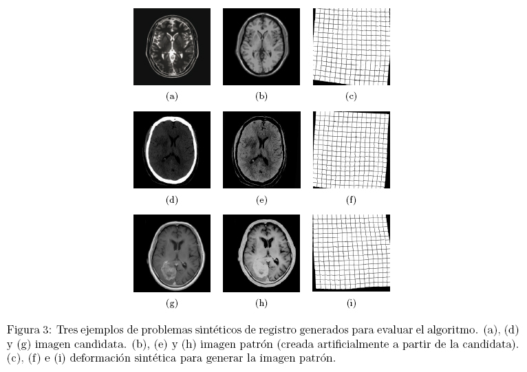Finalmente, cabe mencionar que existen algoritmos de registro elástico que no parametrizan el espacio de deformaciones [43], pero no encontramos en la literatura, tecnicas multimodales que sigan este mismo enfoque aplicado en imágenes medicas, motivo por el cual no se compara esta propuesta con otros algoritmos de registro elástico multimodal.