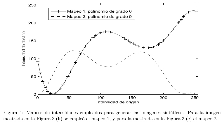 Además, con la finalidad de obtener datos numéricos que nos proporcionen más información sobre el desempeño del algoritmo, se simularon 20 pares de imágenes alineadas de resonancia magnética T1 y tomografía computarizada (MR/CT), empleando el software de simulación reportado en [41] y disponible en línea en http://www.bic.mni.mcgill.ca/brainweb/. Siete de los pares fueron en corte sagital, siete en axial y seis en coronal, con un tamaño de pixel de 1 x 1 mm y con un nivel de inhomogeneidad de intensidades de entre 0% y 40%. Tambien se adquirieron una tomografía computarizada y una resonancia magnética T1 en corte transversal (tamaño de pixel de 1x 1 mm), Figuras 3.(d) y 3.(g), tomadas de diferentes pacientes con un tumor cerebral en el Hospital San Raffaele y proporcionadas por el Institute of Molecular Bioimaging and Physiology, ambos en Milan, Italia. Con éstas muestras se simularon dos pares de imágenes multimodales alineadas usando dos polinomios de grado 6 y 9 como mapeo de intensidades (ver Figura 4). Después, a una imagen de cada par simulado se le aplicó un campo vectorial de deformación elástico generado a partir de Thin Plate Splines [42], los cuales se tomaron como campo de referencia (ground truth GT, ver Figura 3) y se utilizaron para calcular el error del algoritmo de registro en la estimación del campo vectorial de la deformación, usando como métrica la norma Euclideana.