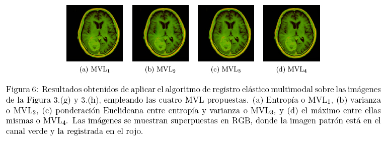 Observando la Figura 4, se puede apreciar que las estructuras del cráneo, la tráquea, el tracto nasal, el bulbo y la médula espinal, se alinean congruentemente (en tonalidades amarillo verdosas) en tres de las cuatro MVL (entropía, varianza y obteniendo el máximo); con respecto a otras estructuras o tejidos, es difícil para alguien sin formación médica y experiencia en análisis de imágenes de este tipo, tener la certeza de que se encuentran alineadas correctamente todas las estructuras y tejidos. Para realizar un análisis cuantitativo sobre estos resultados, se requeriría del usode tecnicas de segmentacion así como de índices de evaluacion sobre ciertos estándares médicos, además de que la evalución sobre ciertos entándares médicos, además de que la evaluación dependerá de los tejidos y/o estructuras que un médico especialista quisiera analizar en las imágenes [17, 27], asunto que no era de interés para este trabajo por el momento, ya que el estudio está orientado a probar la eficiencia del algoritmo en la estimación del campo vectorial denso de la deformación. En este punto cabe señalar que las imágenes registradas en este experimento a pesar de ser ambas resonancias magnéticas T1 (ver figura 2), las intensidades en escala de grises no representa un mapeo biyectivo entre ambas, debido a que pertenecen a diferentes pacientes y fueron adquiridas bajo diferentes condiciones; además de que la deformación elástica requerida para poder alinearlas no es fácil de estimar y es muy poco probable que se presente en casos reales de registro dentro de la imagenología médica, sin embargo se optó por probar con dichas imágenes para tener una idea de la capacidad de algoritmo presentado para estimar este tipo de deformaciones, ademas de ser un problema similar al que se tiene en el registro de átlases médicos [39].