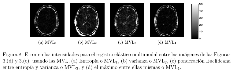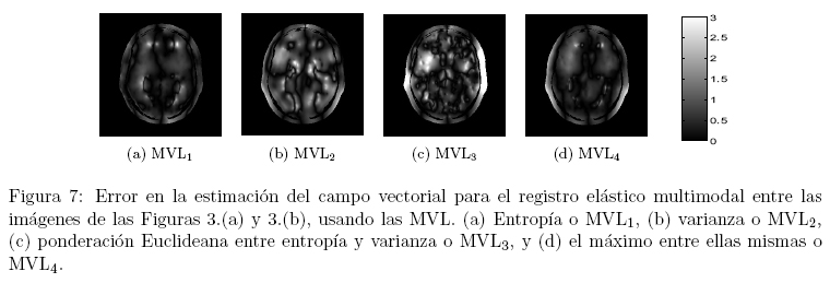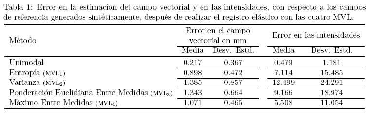 En la Tabla 1 se presentan la media del error y su desviación estándar, calculado con la norma Euclideana, del campo vectorial estimado por el algoritmo de registro elástico con las cuatro MVL, donde tambien se incluye la media del error obtenida con la version unimodal del algoritmo que nos servir a como punto de referencia, ya que idealmente los resudados de las MVL tendrían que ser muy cercano a estos valores y que es factible calcular dado que se utilizaron transformaciones de intensidad sinteticas. De la misma forma, en la Tabla 1 se muestra la media y desviación estándar del error en las intensidades obtenidas por las cuatro MVL con los dos pares de imágenes de las cuales se conoce su mapeo de intensidades que se muestran en la Figura 4.