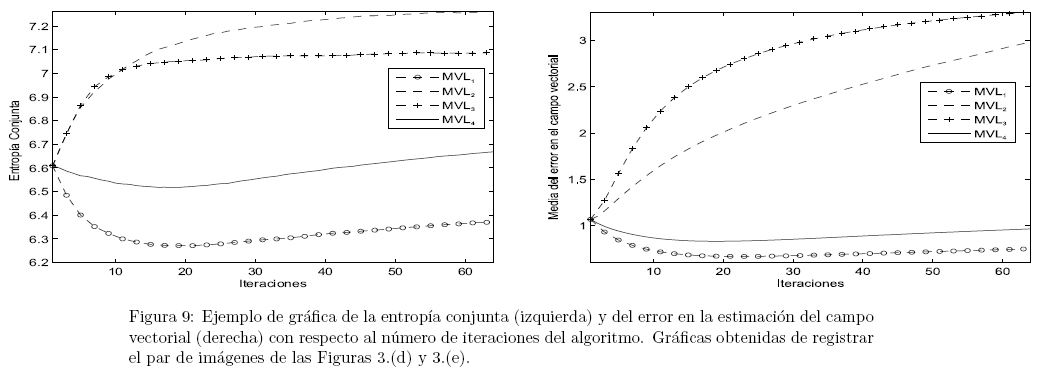 Por último, como parte de los resultados en la figura 9 se muestran las gráficas de la entropía conjunta y la media del error en el campo vectorial de las imágens registradas, ambas con respecto al número de iteraciones del algoritmo, con la intensión de mostrar gráfica y númericamente la convergencia del método presentado.