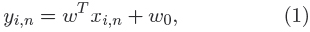 where w and w0 correfpond to the parameters determined by the first classification stage and xi,n represents the i-th feature vector in the n-th stimulation sequence for- i=1,2,..., 12 (i.fr each of the twelve targets) and for n=f ,2,..., N. As it was mentioned, the sign of this result indicates the side of the hyperplane on which the data fall; to gather the evidence each target presents at the end of every stimulation sequence a cumulative distance vector, Yin, is constructed whose n-th element is computed in the following terms: