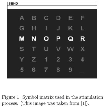 The brain-computer interface (BCI) known as Donchin's speller [1], allows communicating text using random intensifications of each row and column of a character matrix to evoke EEG event-related potentials (ERPs) [2]. The user focuses attention on the cell containing the letter to be communicated while the rows and the columns of the matrix are intensified, as shown in figure 1. This application is based on an oddball paradigm; the row and the column containing the letter to be communicated are "rare" items which elicit the P300 component and, therefore, can be determined.