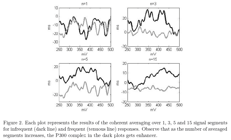 This application has the drawback of requiring long periods of time before obtaining a reliable result. One of the reasons behind this inconvenience is that the signal amplitude is too small in comparison with the EEG background activity, which hinders the detection of event-related responses. A way to improve the signal to noise ratio is using coherent average techniques [3]; which enhance common response features and reduce noise, as shown in figure 2, where the averaging process results over 1; 3; 5 and 15 EEG signal segments are illustrated.