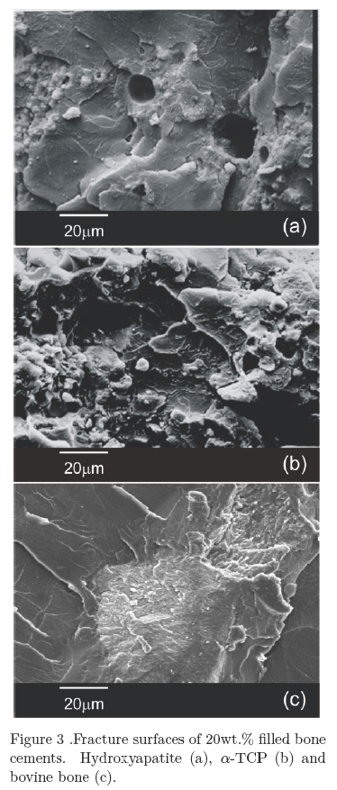 For comparison purposes Simplex P (Howmedica), CMW 3 (DePuy), Cemfix (Teknimed) and Osteobond (Zimmer) were prepared according to manufacturer instructions and mechanically tested. Fracture surfaces of the bioactive bone cement° were obéerved after the tensile experiments by using a JEOL JSM 5900-LV SEM.