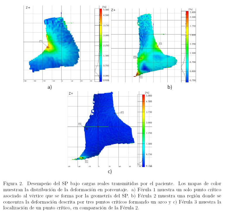 En este trabajo fue posible observar las deformaciones que se localizaron en un análisis dinámico, es decir, aplicando cargas y posturas verdaderas del paciente al caminar. En la actualidad no existen resultados similares reportados en la literatura. Los trabajos reportados previamente muestran mediciones que se realizaron con fuerzas puntuales y simulaciones de cargas [10-15]. En comparación con la literatura, los resultados de este trabajo presentan deformaciones reales con carga y posturas habituales del paciente, además de que las pruebas se realizan directamente con la prótesis que el paciente utiliza para uso diario.
