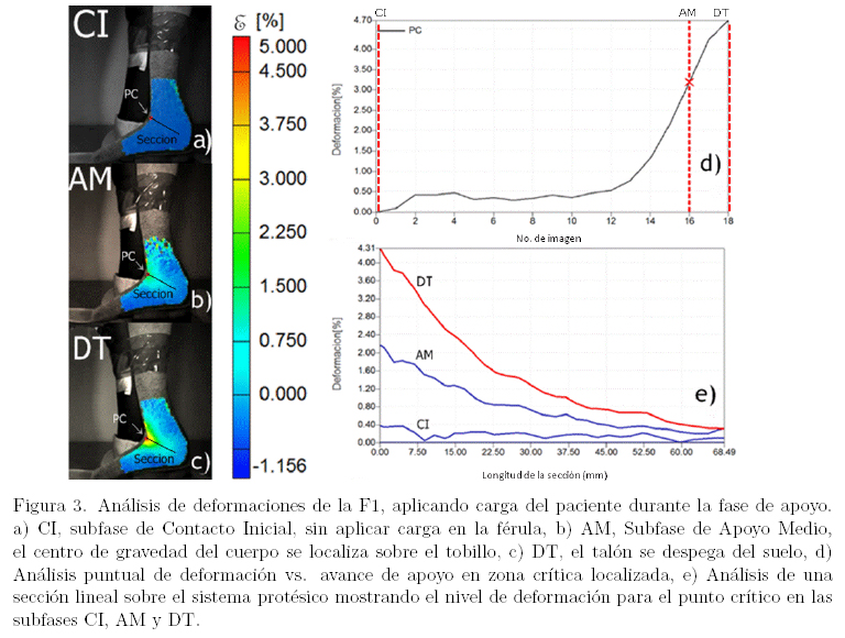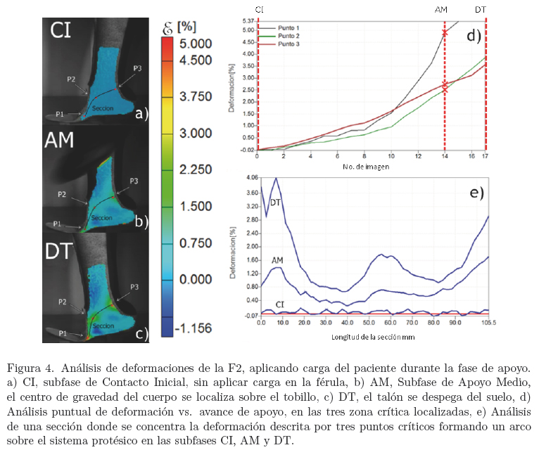 La metodología aplicada en este trabajo permitió evaluar la deformación real de un sistema protésico en uso; además ayudó a localizar los principales puntos críticos donde se concentra la deformación en el sistema protésico durante la marcha del paciente en donde se involucran cargas y posturas de un usuario a lo largo de este gesto motor. Una de las principales ventajas que ofrece esta metodología es que se trata de una prueba no destructiva de mínimo contacto, por lo que será posible medir una variedad de sistemas protésicos en distintas condiciones de uso.