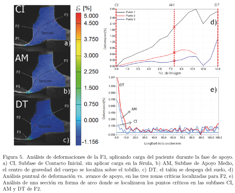 En la Figura 4e se muestra el análisis de esta sección, en donde se midió la deformación durante tres etapas de la fase de apoyo en la marcha. Se eligió esta sección ya que es la zona más propensa a la fractura según los resultados gráficos de la deformación (Figura 2b). El porcentaje de deformación mas alto es en la fase de DT y es de aproximadamente 4.06%.