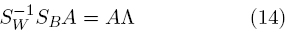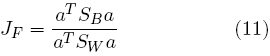 , ∀i = 1,...,C, son las medias muestra y las matrices de covarianzas de cada clase (con ni muestras), y m es la media muestra de todas las clases. Aquí, se busca un conjunto de vectores de características ai que maximice JF, sujeto a la restricción de normalización ajTSWaj = δij (los vectores de clase centralizados en el espacio transformado son no correlacionados). Esto conduce a la ecuación del eigenvector generalizado simétrico