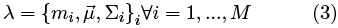 . El conjunto de modelos GMM es parametrizado por los vectores de medias, matrices covarianza y las ponderaciones de las mezclas para las densidades Gaussianas. El modelo que contiene los parámetros es representado por la siguiente expresión[16, 17, 23, 24]: