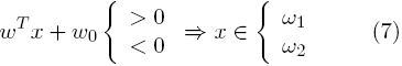 Supóngase que se tiene un conjunto de vectores de prueba {xi, x2,...,xn} (estos son, los vectores MFCC), cada uno de los cuales es asignado a una de dos clases, ω1 o ω2 (en nuestro caso pueden ser LS normales y anormales). Usando el conjunto designado, se busca un vector de pesos ω y un umbral ω0 tal que se pueda obtener la siguiente ecuación de clasificación: