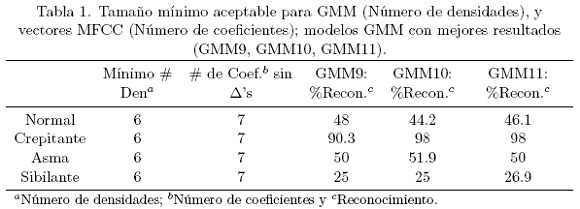 Uno de los primeros experimentos con reconocimiento de señales LS fue realizado calculando diferentes tamaños de modelos GMM, extrayendo observaciones de la base de datos RALE como vectores acústicos MFCC, y entonces calculando un diccionario de modelos usando señales normales, crepitantes, sibilantes y asmáticas, como se muestra en la Tabla 1. Otros experimentos fueron realizados para obtener el tamaño mínimo razonable para un modelo GMM, como se muestra en las Tablas 1 y Tabla 2. Básicamente, en estos experimentos se varía el tamaño del vector y del modelo, teniendo también en cuenta la inclusión o exclusión de las derivadas del vector MFCC. Los coeficientes del vector MFCC están relacionados a la energía resultante de un conjunto de filtros, los cuales están linealmente distribuidos hasta el orden de los 1000 Hz, pero logarítmicamente para frecuencias mayores. La primera y la segunda derivada son sensibles al ruido, y pueden ser confundidas con crepitancias, mientras que éste no es el caso con las otras señales. No obstante, las derivadas son útiles para inspeccionar la dinámica o la evolución de la señal.