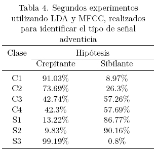 Una explicación puede ser que las señales normales utilizadas fueron de un conjunto diferente (exclusivamente de los estudiantes de ingeniería), y las mediciones fueron obtenidas de un solo punto de auscultación, i.e., el más cercano al pulmón, donde más señales coincidieran (Tabla 3 y 4). Por el contrario, las señales crepitantes y sibilantes mostraron peores resultados; esto puede ser debido a que se usaron diferentes puntos de auscultación en comparación con los otros experimentos (de la base de datos RALE). Asimismo, es importante ver las características propias de cada señal; en el caso de C4, ésta contiene crepitancias gruesas (distinguidas de las finas C1, C2 y C3 por sus componentes frecuenciales bajos), así como S3 que contiene rhonchus (sibilancias con contenidos frecuenciales bajos). Lo anterior puede ser un indicio del porqué el sistema de reconocimiento (LDA) confundió estos dos tipos de señales. De cualquier manera, es obvio que este método mejora la clasificación entre dos clases (normal y anormal), pero es necesario llevar a cabo más experimentos para ser más concluyentes en el caso de más de dos clases.