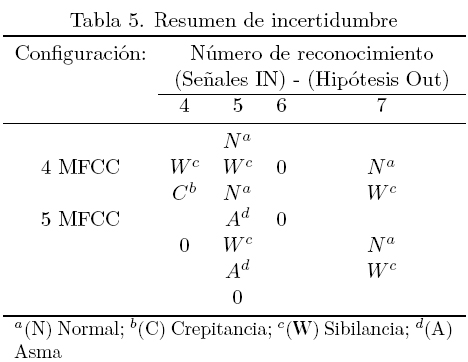 En el contexto del reconocimiento de voz, es necesaria una gran cantidad de datos con el fin de computar modelos más robustos [15-18]. Desafortunadamente, la base de datos RALE carece de un número deseado de grabaciones para representar enfermedades respiratorias del paciente, o detalles acústicos de las vías aéreas respiratorias. No obstante, la función del sistema respiratorio sirve como una fuente útil de información acústica para la aproximación mostrada en este trabajo. Adicionalmente, las señales adventicias de RALE no están relacionadas con un grupo de edad particular o características individuales, o una localización definida del cuerpo. Pero a pesar de estas limitantes, los experimentos mostraron una precisión superior al 50% en evaluaciones VC, lo cual confirma el potencial de esta metodología [20]. La Tabla 5 muestran la incertidumbre (hipótesis erróneas) durante la etapa de evaluación, conteniendo la cantidad de coeficientes incluidos en los vectores MFCC, número de densidades con las que se elaboraron los modelos GMM, así como también las señales de evaluación (N, C, A, W o S); considerando una señal de entrada a reconocer (IN) y la hipótesis de salida del sistema (OUT). Las incertidumbres fueron: 1 con un modelo de cuatro densidades (i.e., una señal Sibilante W de entrada, fue reconocida por el sistema como una señal crepitante C, utilizando un vector de 4 coeficientes MFCC y un modelo de 4 Gaussianas), 3 con modelos de 5 densidades (N-W, N-A, W-A), y dos con modelos de siete densidades (N-W, N-W).