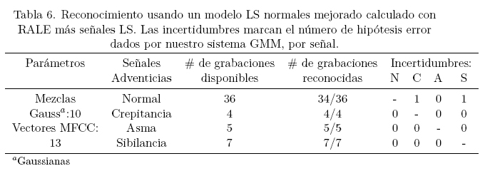 Las incertidumbres en la Tabla 5 son debidas principalmente a la similitud entre los parámetros estadísticos de las señales normales y sibilantes. Tratando de diferenciar entre estos sonidos, el modelo normal fue calculado usando grabaciones adicionales de LS obtenidos de estudiantes de ingeniería, con el fin de confirmar que la falta de señales normales ocasionó las incertidumbres, i.e. modelos menos robustos. Esta última observación fue confirmada computando un modelo, el cual incluía señales normales adicionales de LS normal, arrojando un menor número de incertidumbres (Tabla 6).