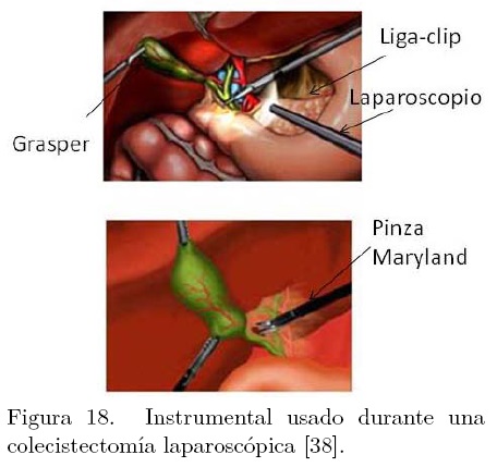 Durante una colecistectomía laparoscópica se utilizan ciertos instrumentos o dispositivos quirúrgicos como las pinzas de agarre o grasper, el gancho o pinzas de Meriland, la engrapadora y las tijeras o bisturí armónico. La Figura 18 ilustra algunos de los instrumentos mencionados.
