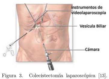 El laparoscopio se introduce por uno de los puertos. Las imágenes recibidas por éste son magnificadas y proyectadas en un monitor. Se insertan instrumentos quirúrgicos a través de los puertos que serán usados para sujetar la vesícula, disecarla (cortarla) y engrapar sus conductos discados y cortar tanto la arteria principal como el conducto cístico. La vesícula es entonces removida por uno de los puertos como se muestra en la Figura 5. Las imágenes son observadas con mucho cuidado y detenimiento por el cirujano para identificar cualquier hemorragia. Antes de retirar el laparoscopio, se examina nuevamente el abdomen verificando que no existan complicaciones. Las incisiones son cerradas con suturas o grapas.