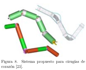 En [23] se propone el diseño de brazos articulados reducidos que pueden ser usados como instrumentos quirúrgicos en cirugías de corazón practicadas en pacientes adultos. En este caso los brazos son introducidos a través de un trocar situado entre dos costillas (ver Figura 8).