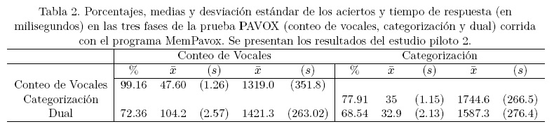 La prueba PAVOX ha sido empleada en población mexicana tanto en personas sanas (niños y adultos) [9-10] como en niños con hiperplasia adrenal congénita [13] y esquizofrénicos [14]. A este respecto, Gómez y col. [9] aplicaron la prueba PAVOX a 24 jóvenes, quienes realizaban dos veces la fase dual, una con recompensa y una sin ésta. Los autores encontraron que el número de respuestas correctas en la fase dual era mayor cuando a los participantes se les daba una recompensa económica; además, no se encontraron diferencias significativas en el número de respuestas correctas relacionadas con la posición de la palabra a categorizar en cada ensayo (fases de categorización y dual). Hallal y col. [10], encontraron que el desempeño en la prueba de mujeres jóvenes era mayor al de las maduras en las tres fases de la prueba. Sin embargo, independientemente de su edad, las mujeres con actividad laboral, presentaron mayor porcentaje de aciertos en la categorización semántica que aquéllas sin dicha actividad. Inozemtseva y col., [13] observaron un menor número de aciertos en la categorización, así como un mayor tiempo de respuesta en el conteo de vocales en niñas con hiperplasia adrenal congénita con respecto a niñas normales. Por último, Rosales y col. [14] encontraron que los esquizofrénicos tenían un menor número de aciertos y mayor tiempo de reacción en las fases de categorización y dual; para la aplicación del PAVOX, los autores [14] emplearon el programa de computadora MemPavox.